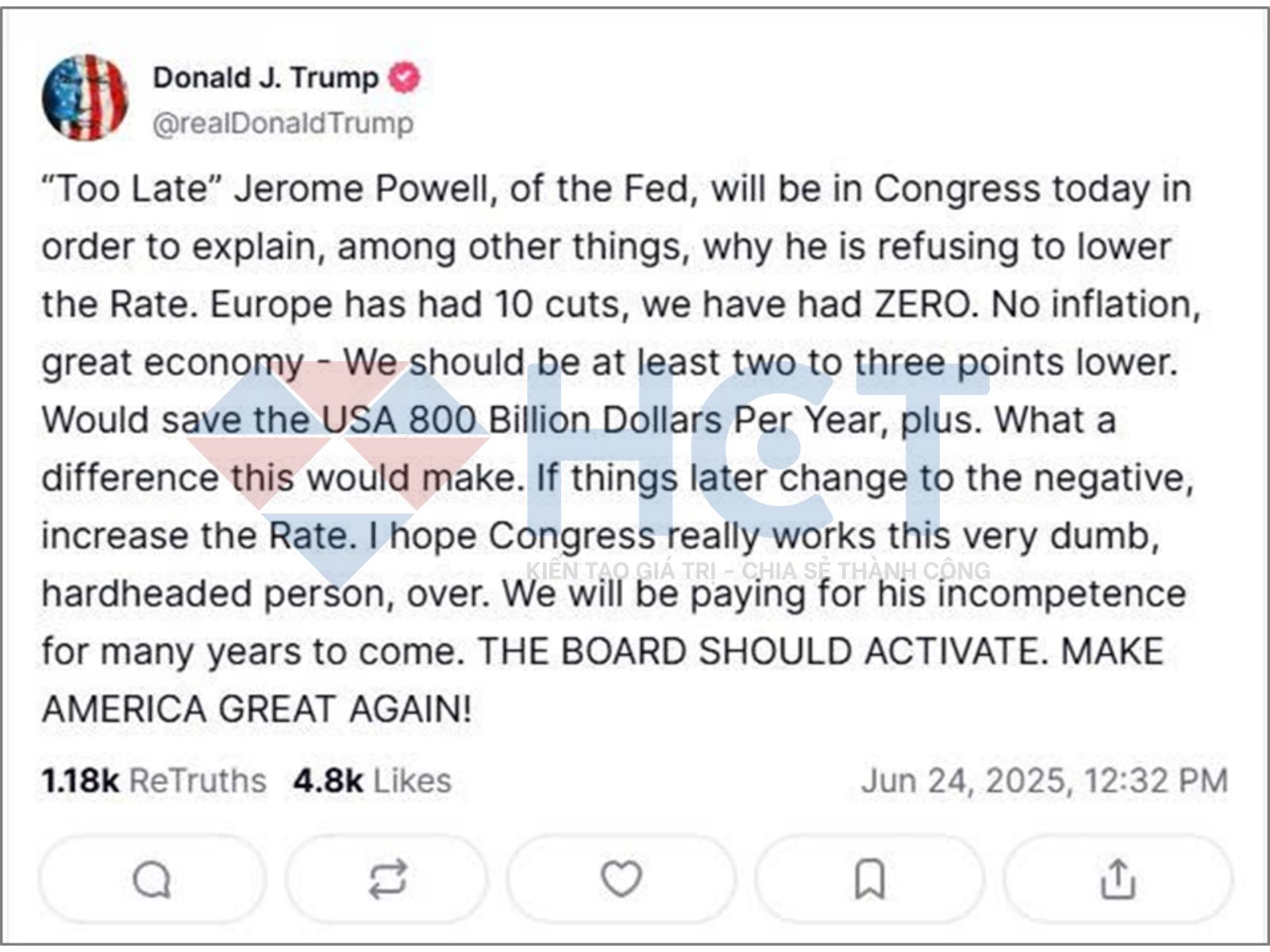 Trong bài đăng ngày 24/6 trên nền tảng Truth Social', Trump nhấn mạnh rằng châu Âu đã cắt giảm lãi suất 10 lần, trong khi Mỹ vẫn “án binh bất động”, dù lạm phát đã được kiểm soát và kinh tế đang bùng nổ. Ông cho rằng việc hạ ít nhất 2–3 điểm phần trăm có thể giúp nước Mỹ tiết kiệm khoảng 800 tỷ USD mỗi năm từ chi phí trả lãi nợ công.