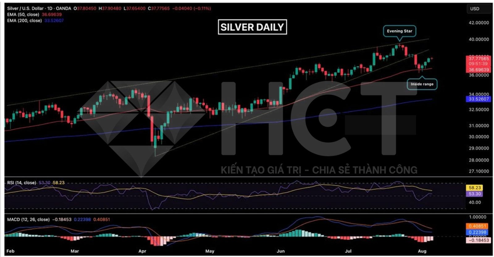 Tuy nhiên, giá bạc đã phục hồi lên 37,3 USD, đúng với mức phục hồi Fibonacci 38%, và hiện đang bám sát ngưỡng kháng cự mới tại 38,77 USD. Vùng hỗ trợ kỹ thuật quanh 36 USD, trùng với đường trung bình 50 ngày, đang hoạt động hiệu quả.